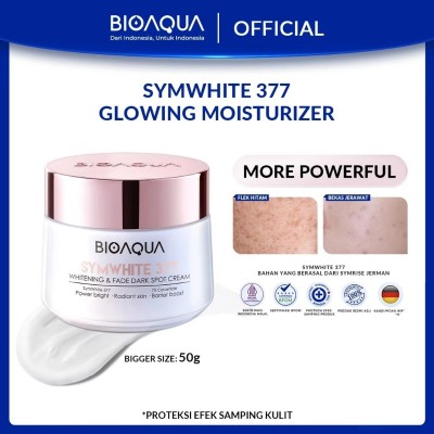 BIOAQUA SymWhite 377 Whitening & Fade Dark Spot Cream 50gBPOM :NA11230100011SYMWHITE 377 GLOWING CREAM10 jenis Kekuatan Pemutih Kulit,Hambat Hiperpigmentasi & Samarkan Noda Hitam