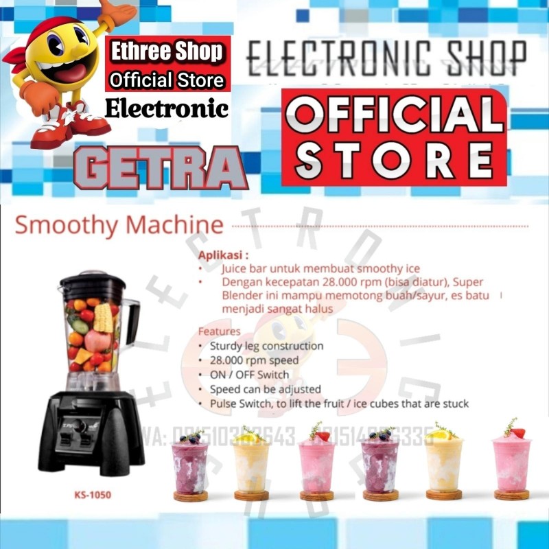 GETRA KS -1050 Blender merupakan juice bar untuk membuat smoothy ice, super blender ini mampu memotong buah atau sayur, es batu menjadi sangat halus sehingga nutrisinya mudah diserap tubuh serta ideal untuk orang yang sedang menjalankan program diet dengan theraphy juice.