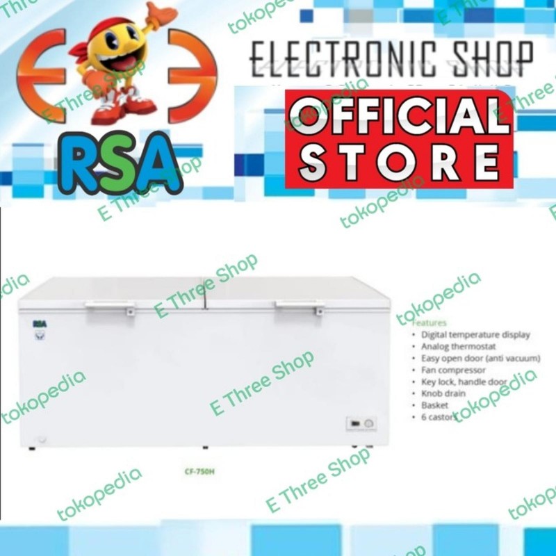 Pengiriman Jabodetabek menggunakan kurir toko. Thanks and Happy Shopping Freezer ini memiliki roda, 2 pintu dengan temperatur -14 sampai -22 c, thermometer digital. RSA Chest CF-750 Freezer juga hemat energy. Spesifikasi Produk :: - Garansi Resmi GEA 1 tahun - Kapasitas 688 Liter - Thermometer Digital - Proses pembekuan yang Cepat - Hemat energy dengan Daya 400 W - Mudah dipindah ,karena ada kaki roda - 2 Handle dan 2 kunci - 1 keranjang - Jenis Freon R290