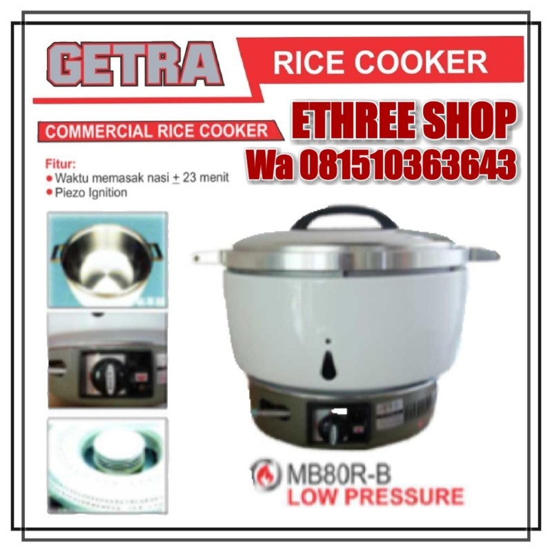 COMMERCIAL RICE COOKER DAN RICE WARMER TIPE (MB80R-B)MADE IN TAIWANSPESIFIKASI COMMERCIAL RICE COOKER TIPE (MB80R-B) :* Waktu memasak nasi sekitar 23 menit* Piezo ignition* Dimensi : 500x500x430mm* Power : 25.000BTU/Jam* Kapasitas Porsi : 60 orang* Kapasitas Panci : 32 liter* Kapasitas Memasak : 16 L* Berat : 20kg