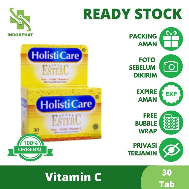 HOLISTICARE ESTER C TABLET merupakan suplemen yang mengandung Vitamin C dalam bentuk ester, sehingga lebih aman di lambung dan penyerapannya di dalam aliran darah menjadi lebih cepat, serta bertahan di dalam tubuh 2 kali lebih lama dibandingkan dengan vitamin C biasa (dalam bentuk Asam Askorbat). Kandungan vitamin C pada suplemen ini memiliki peran sebagai antioksidan bagi tubuh. Selain itu, suplemen ini digunakan untuk memelihara daya tahan tubuh, dan mengatasi gejala kekurangan vitamin C. Indikasi Umum Suplementasi vitamin C untuk membantu memelihara daya tahan tubuh Komposisi Tiap tablet mengandung Ester-C 320 mg yang setara dengan vitamin C 250 mg, Calcium 27,33 mg, Citrus Bioflavonoid 100 mg. Dosis 1 - 3 tablet per hari. Aturan Pakai Sesudah makan, dapat bersama makanan untuk absorpsi yang lebih baik. Kontra Indikasi Hipersensitif terhadap komponen suplemen ini. Perhatian Simpan pada suhu di bawah 30 C dan kering, serta terlindung dari cahaya matahari langsung. Kemasan Dus, Botol @ 30 tablet Manufaktur Indocare Citra Pasific *Sudah Di Review oleh Tim IndoSehat Global*